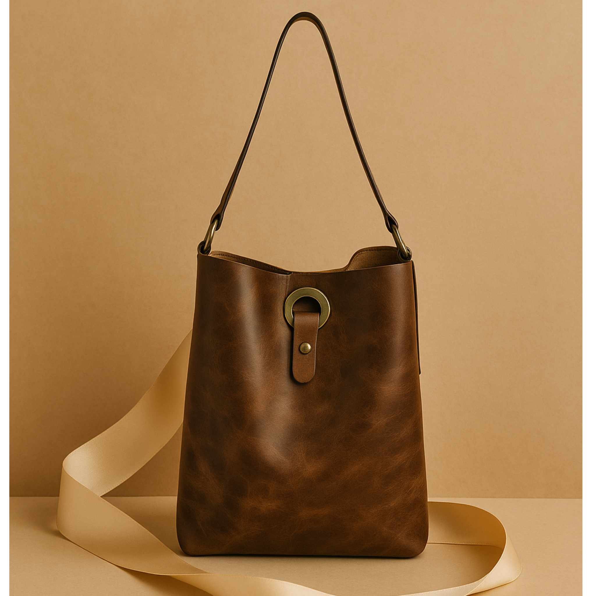 תיק הבאקט עם רצועת הכתף הרחבה הוא תיק בגזרה הקלאסית והעל זמנית שמשדרת אלגנטיות עם קריצה בוהמית. התיק נתפר בבית מלאכה תוך שימוש בעור דק וגמיש בגוון חום שוקולד, הינו בעל תא אחד חלל ללא ביטנה, וכיס תיפור פנימי למפתחות או הנייד.