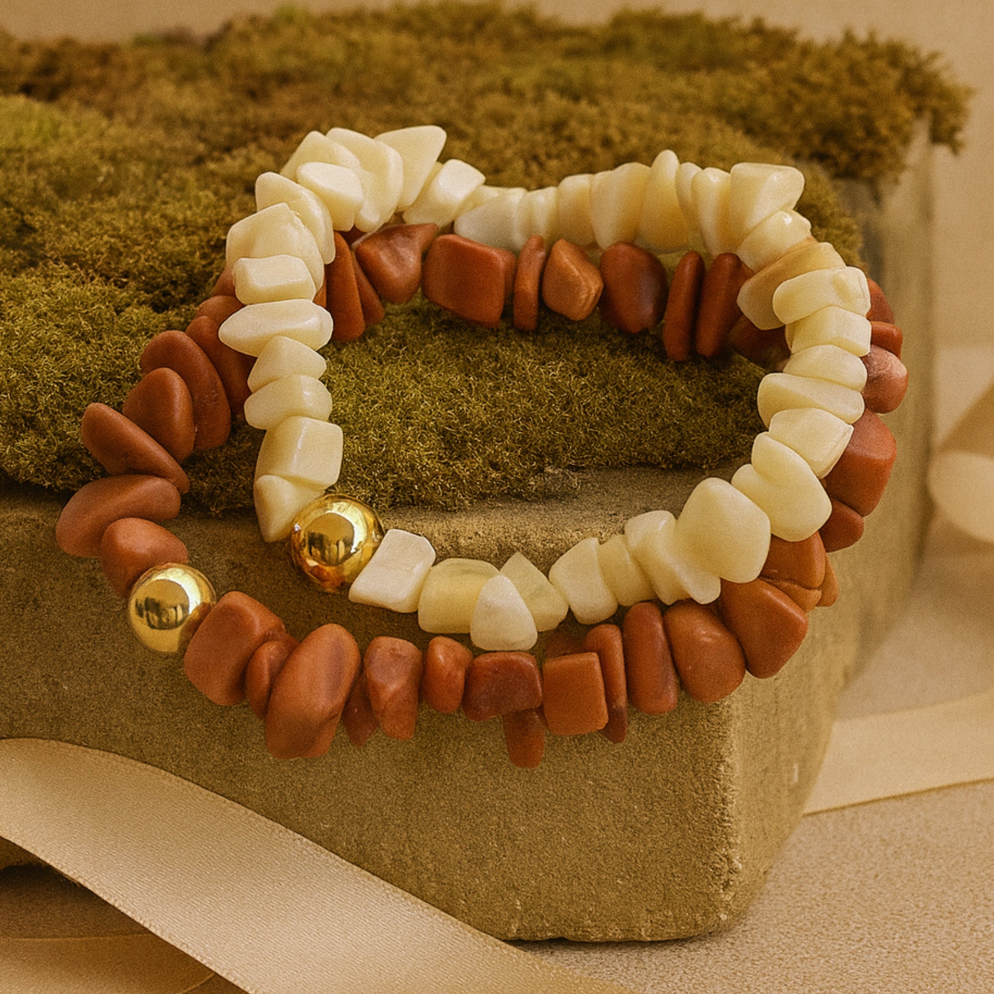 כל סט צמידים מגיע בזוג-שני צמידים בקוטר משתנה על חוט אלסטי, בין 16-18 ס״מ עשויית להיות סטיות קלות , מיוצר בעבודת יד
