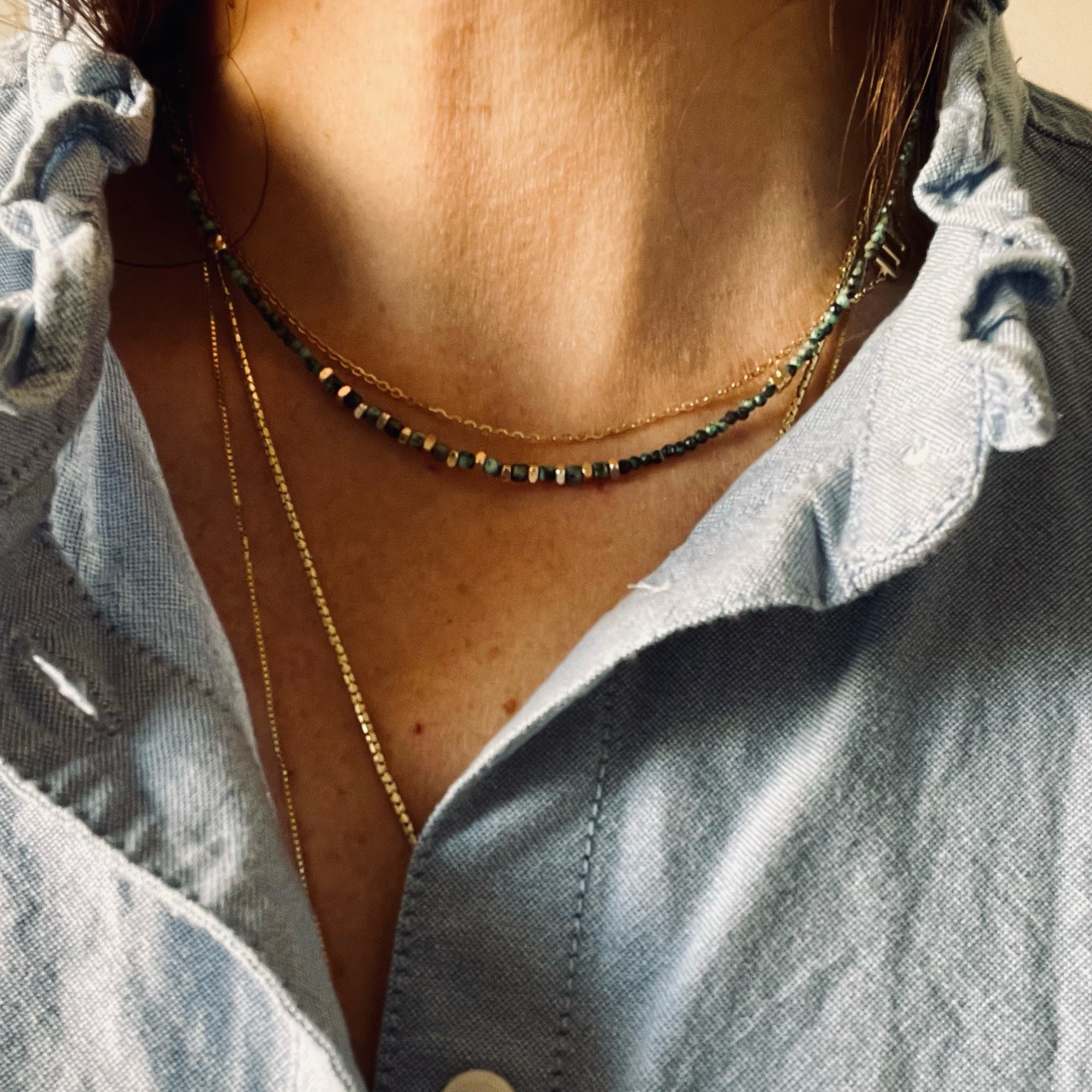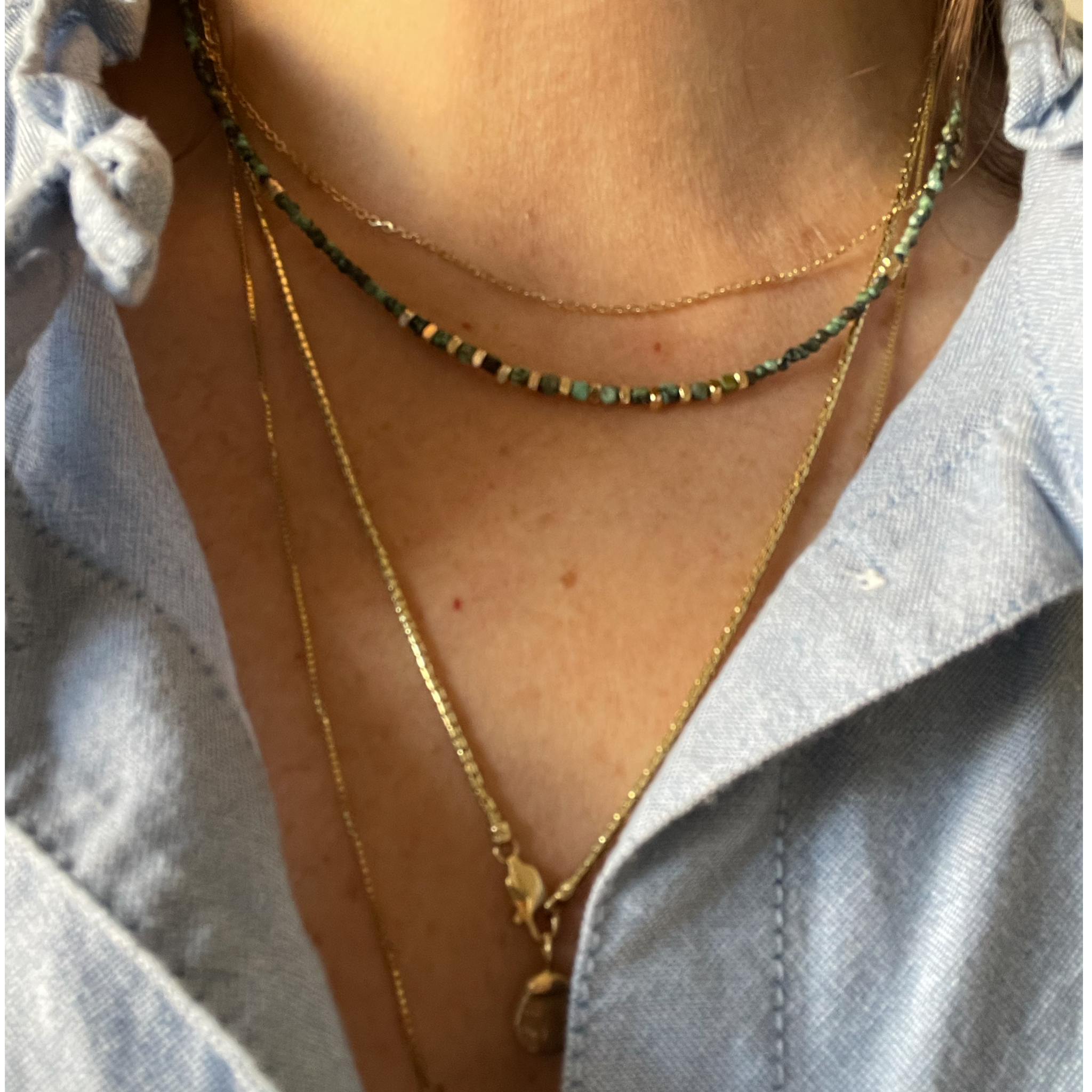 שרשרת באבני טורקיז אפריקאי קטנטנות בצורות משתנות גוונים משתנים והרבה קריסטליזציה טבעית ייחודית לשרשרת. חלקי הזהב בשרשרת הינם ציפוי ולכן רצוי לא להרטיב השרשרת במים למען אריכות ימיה בחן. השרשרת היפה הזאת כיפית בפני עצמה וגם ניתנת להארכה והכי יפה לשלב אותה עם שרשרת זהב עדינה.