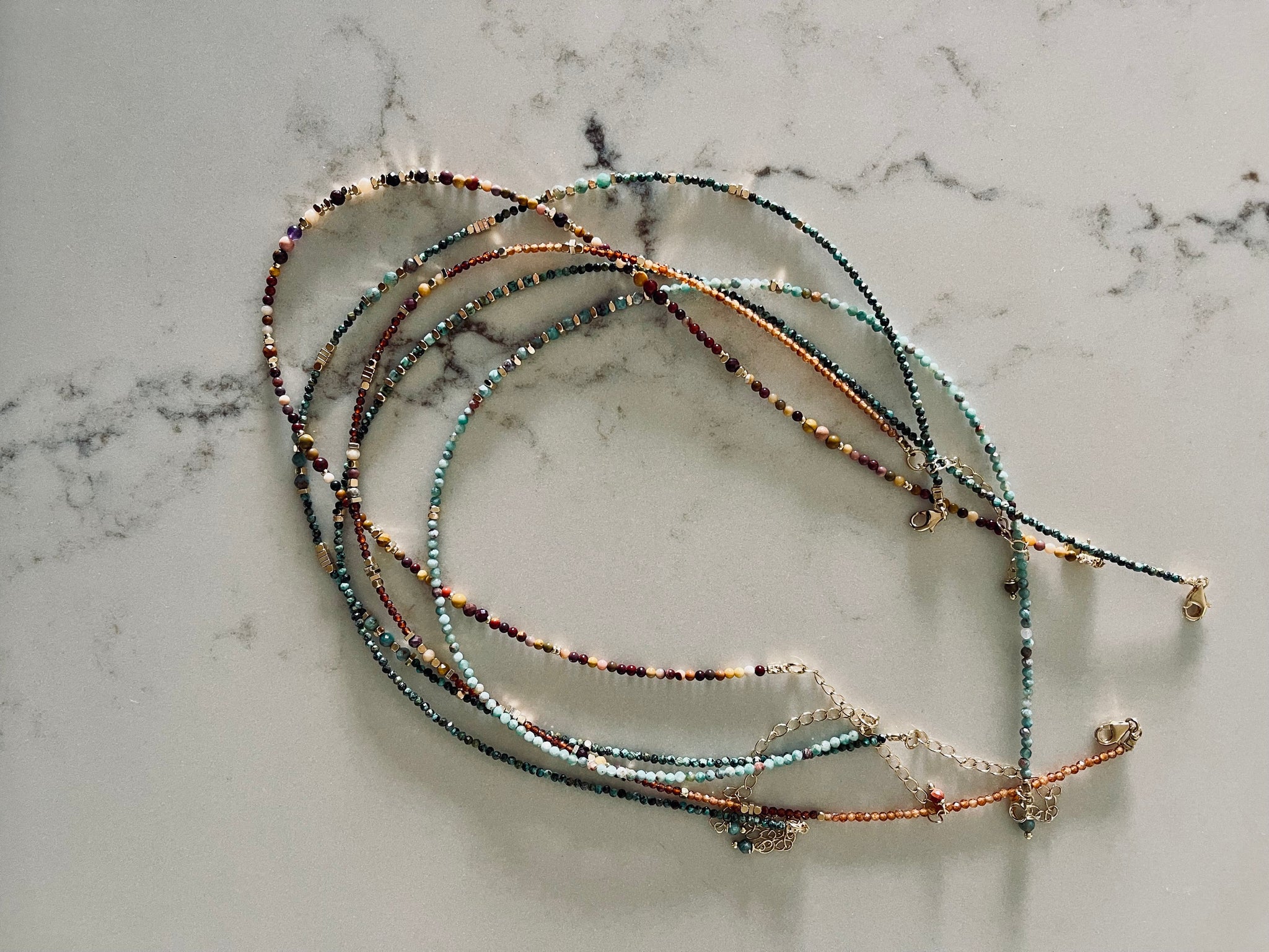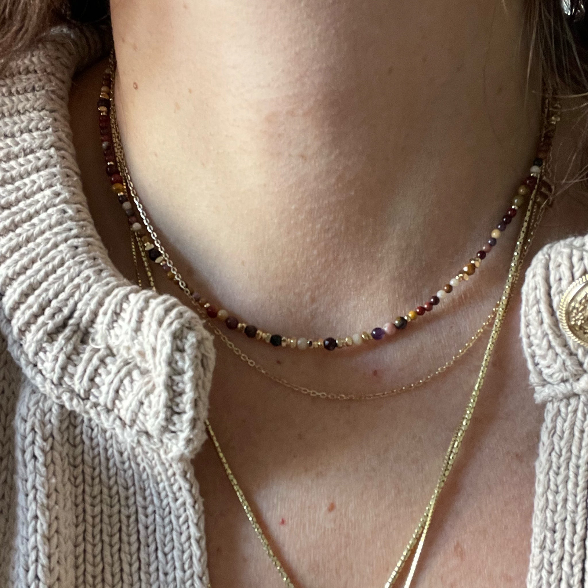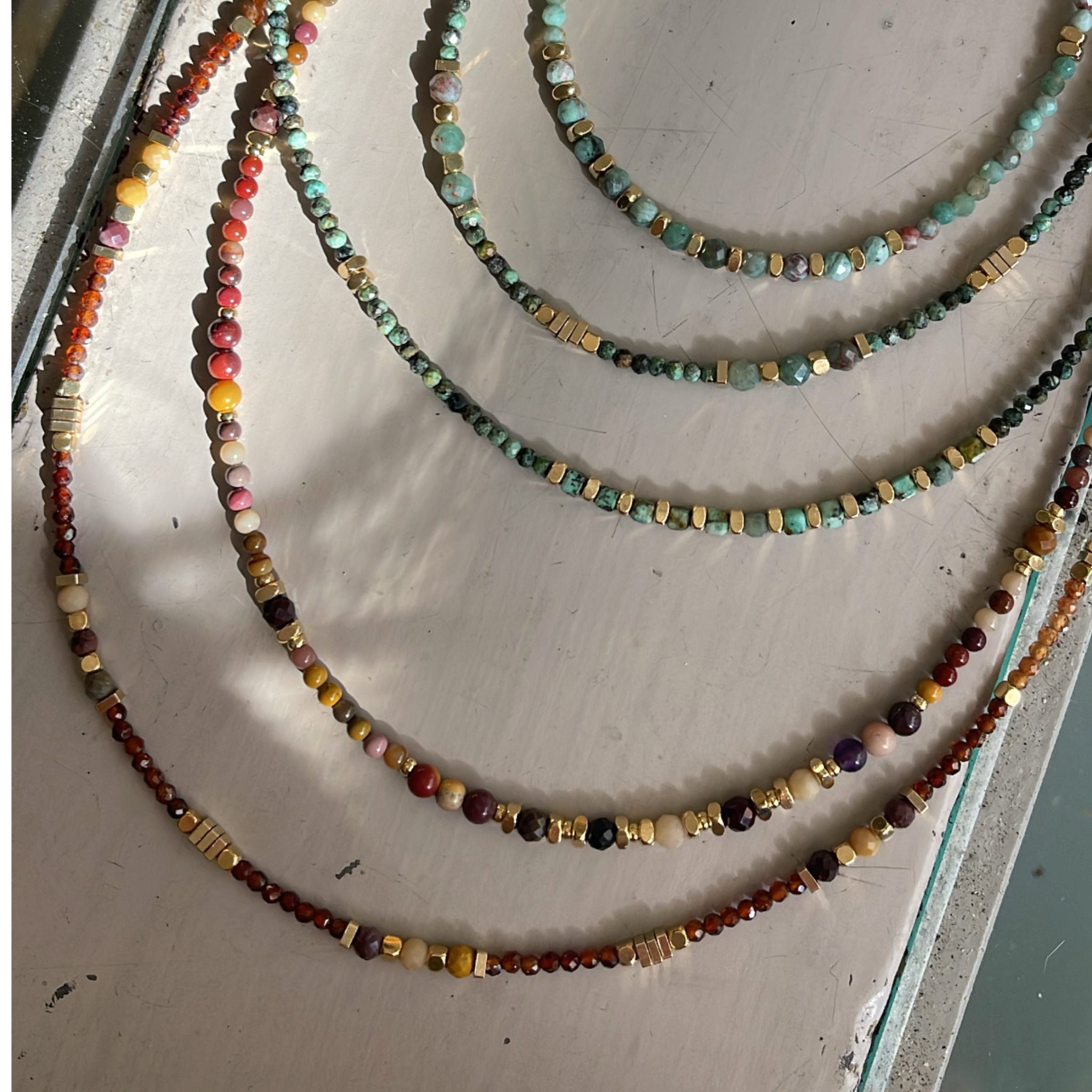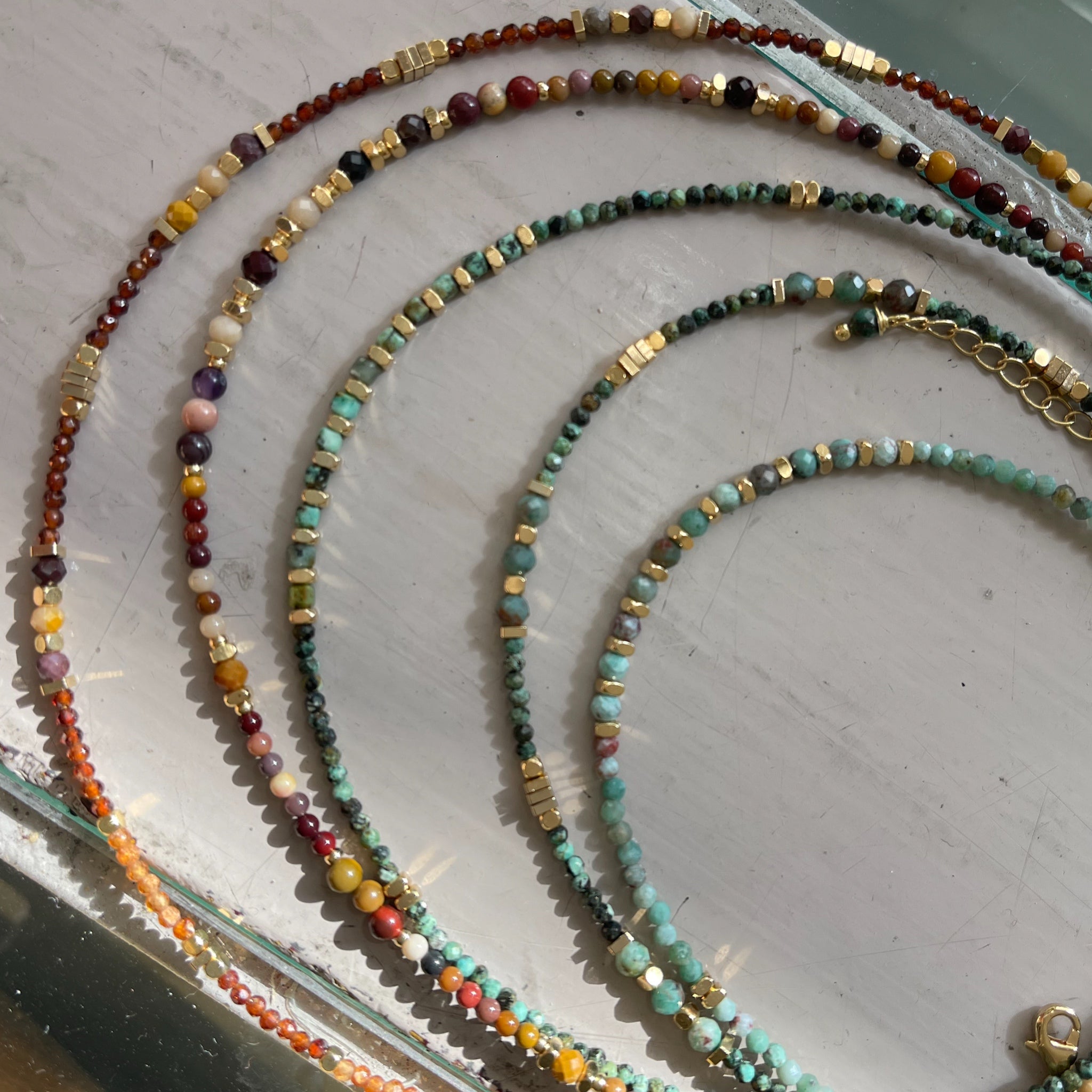 שרשרת באבני ג׳אספר טבעיות בגוונים חמים ומחמיאים. האבנים קטנטנות בצורות משתנות גוונים משתנים והרבה קריסטליזציה טבעית ייחודית לשרשרת. חלקי הזהב בשרשרת הינם ציפוי ולכן רצוי לא להרטיב השרשרת במים למען אריכות ימיה בחן. השרשרת היפה הזאת כיפית בפני עצמה וגם ניתנת להארכה והכי יפה לשלב אותה עם שרשרת זהב עדינה.